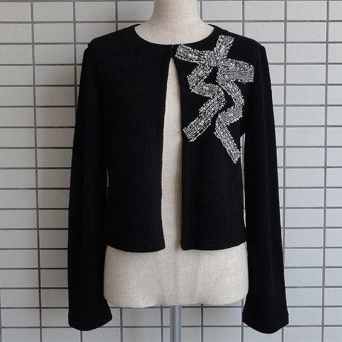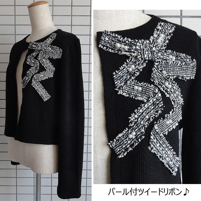 パール付のツイードおリボンがアクセントに! スカートにも、ワンピースにも合わせやすい! レーヨンブレンドの肌触りの良い素材です。