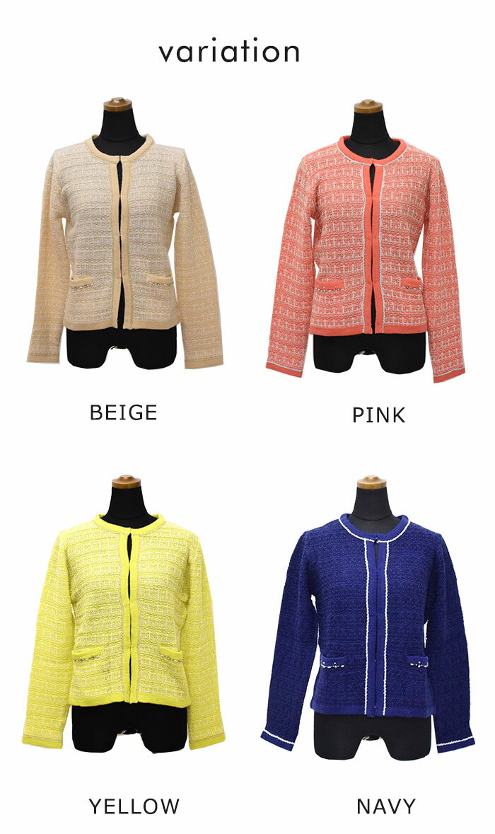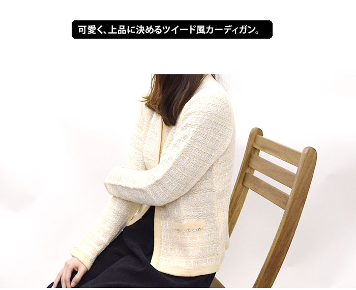 商品スペック 特長 ツイード風の素材で気軽にきちんと感のあるトップスコーデが楽しめるニットカーディガン。